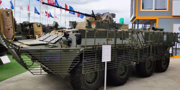 Всё на той же «Армии» представили новый БТР-82АТ за броневой «решёткой» и с дополнительными отражающими экранами.