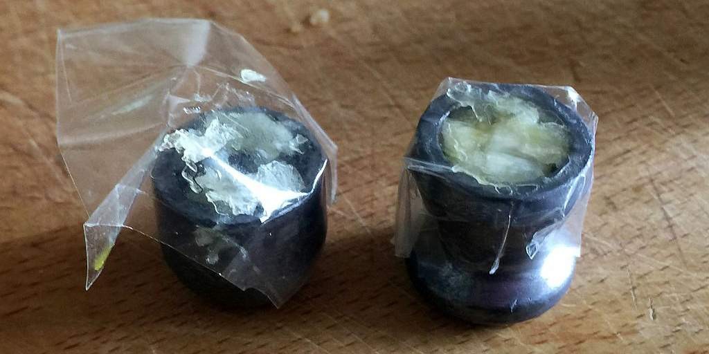 Полости набьём измельчённым сублимированным чесноком. Свежий нарезанный чеснок работает лучше, но имеет сильный демаскирующий запах и по мере высыхания даёт бóльшую усадку, так что количество рабочего вещества со временем уменьшается. Чтобы сублимат не высыпался, закроем полость кусочком скотча (обычного или бумажного). Ещё можно наклеить «дробовой» пыж из рыхлого картона — при попадании в цель он легко разрушится.