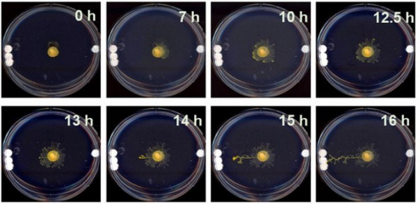 В течение первых 12–14 часов слизистая плесень продвигалась равномерно во всех направлениях, но затем каждый из образцов «выбрасывал» особенно длинную ветвь, которая тянулась над поверхностью геля в направлении трех дисков в 70% случаев. Диски символизировали материал, потенциально интересный организму в качестве места жизни, но оставалось непонятным, как он смог сориентироваться на местности без предварительных знаний о ней.