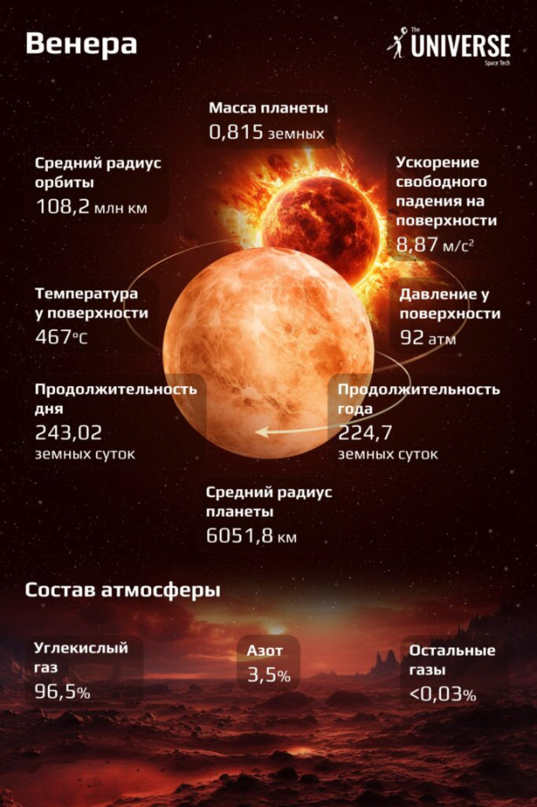 Плотная атмосфера Венеры приводит к значительному парниковому эффекту. Газовая смесь у ее поверхности разогрета до 467°C, а атмосферное давление в 92 раза превышает земное. Кроме того, на больших высотах там присутствуют пары серной кислоты.