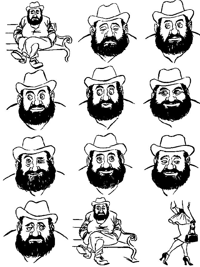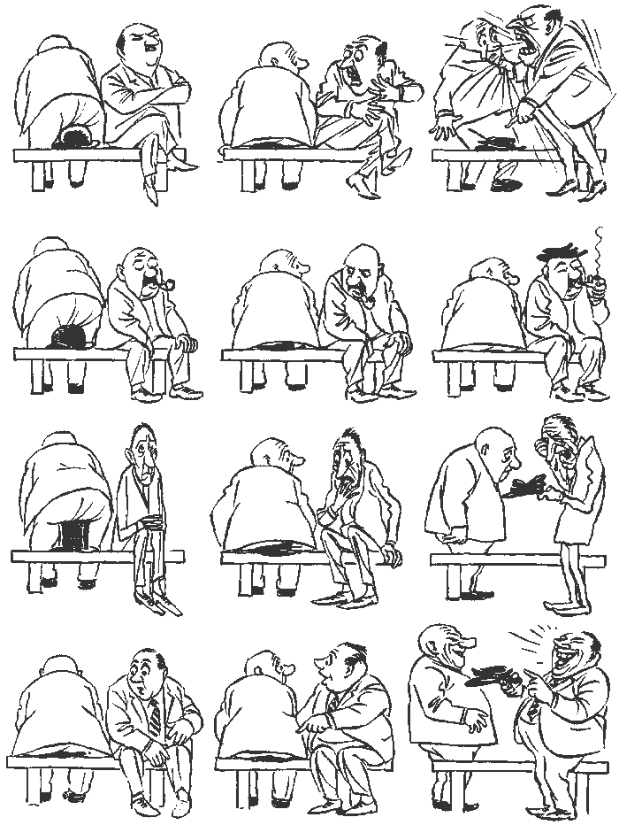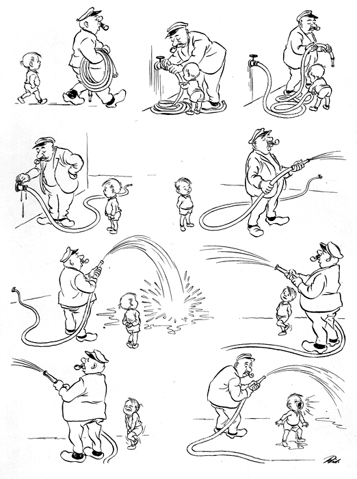 Бидструп писал: " Свои юмористические серии я строю всегда так, чтобы их можно было "читать" слева направо, как читают газеты. В ходе этого рассказа без слов я стараюсь изобразить действующих лиц таким образом, чтобы они предстали перед зрителем, как в кадрах кинопленки. Из рисунка в рисунок я передаю движение фигурок. Это оживляет их."