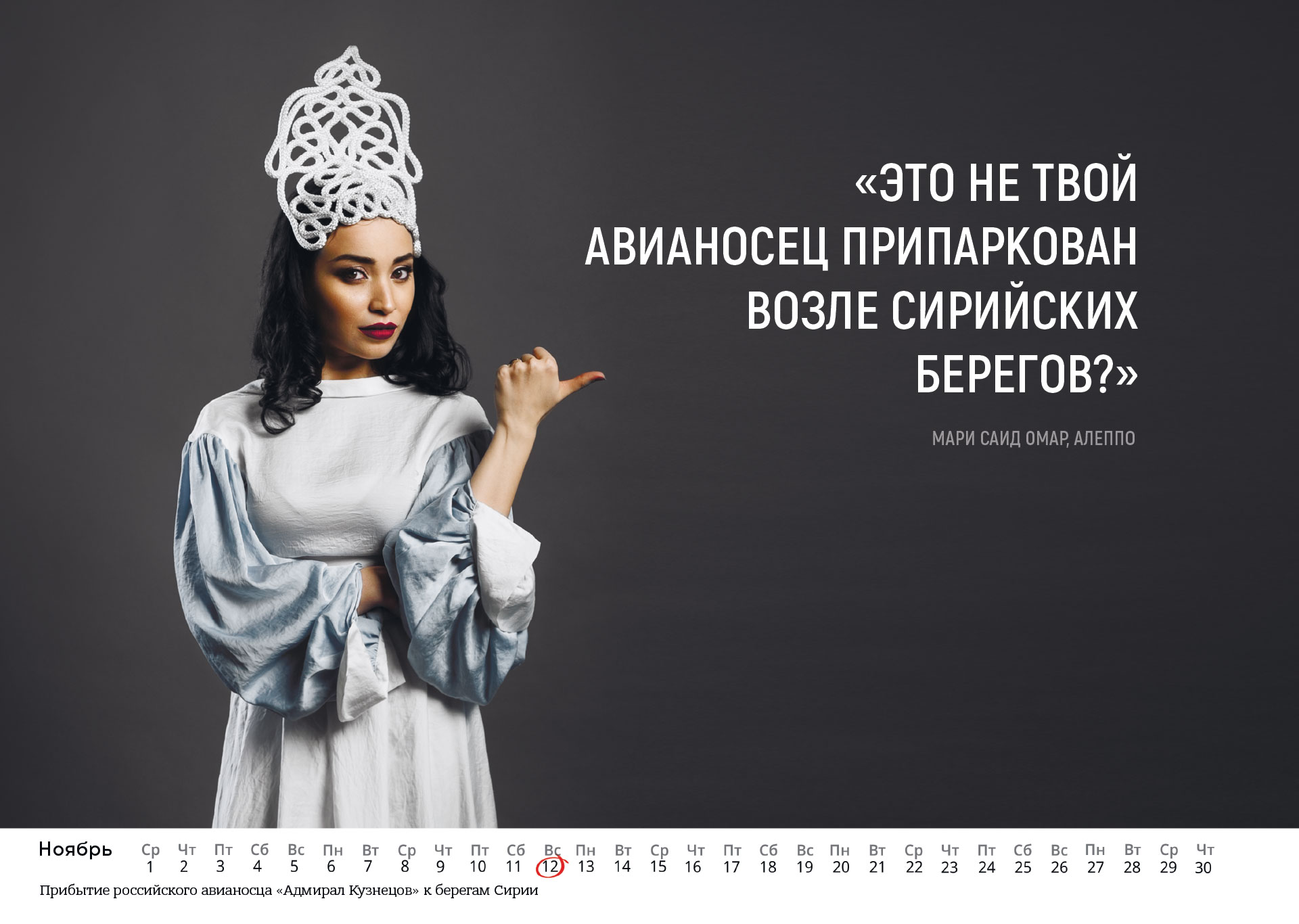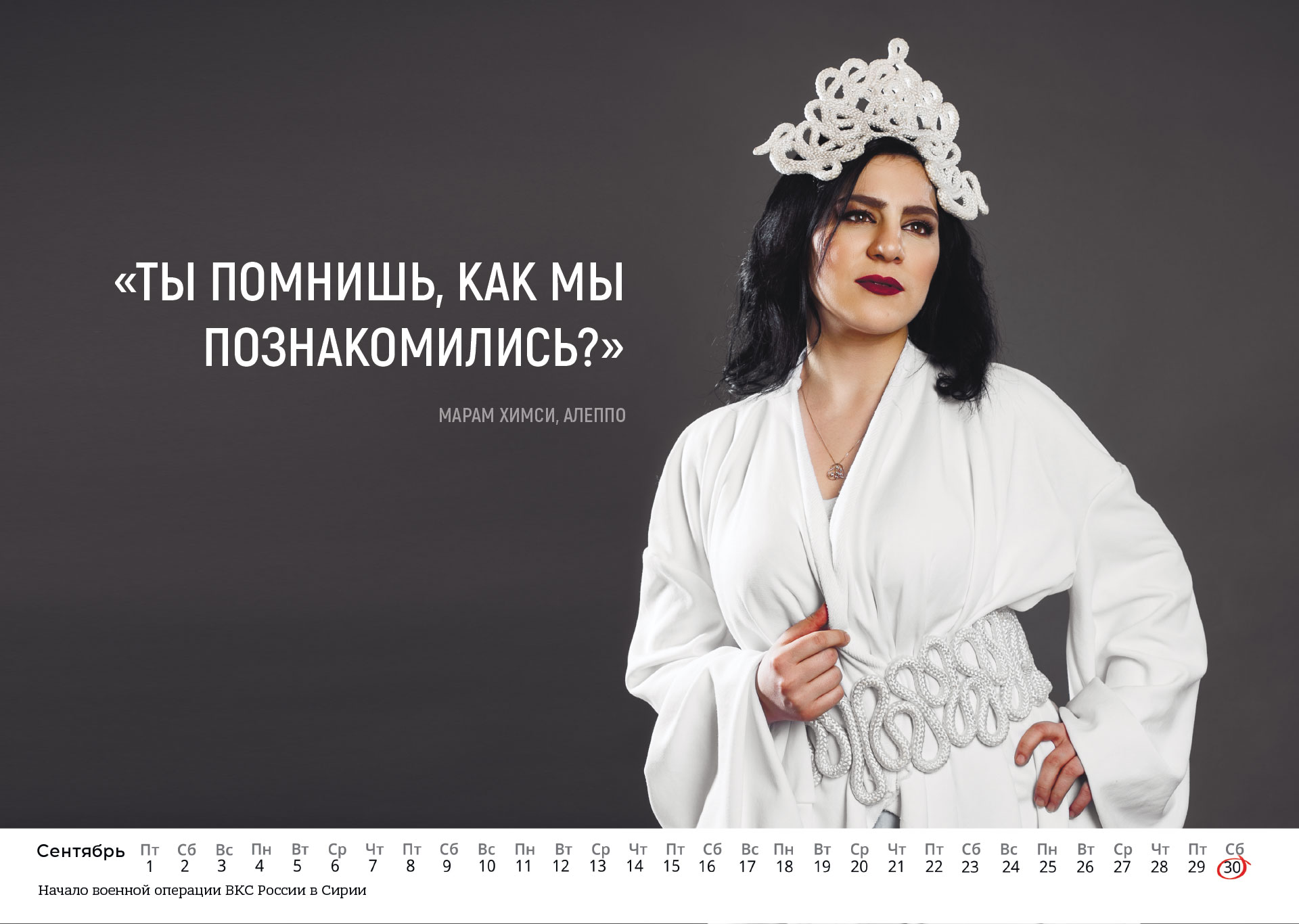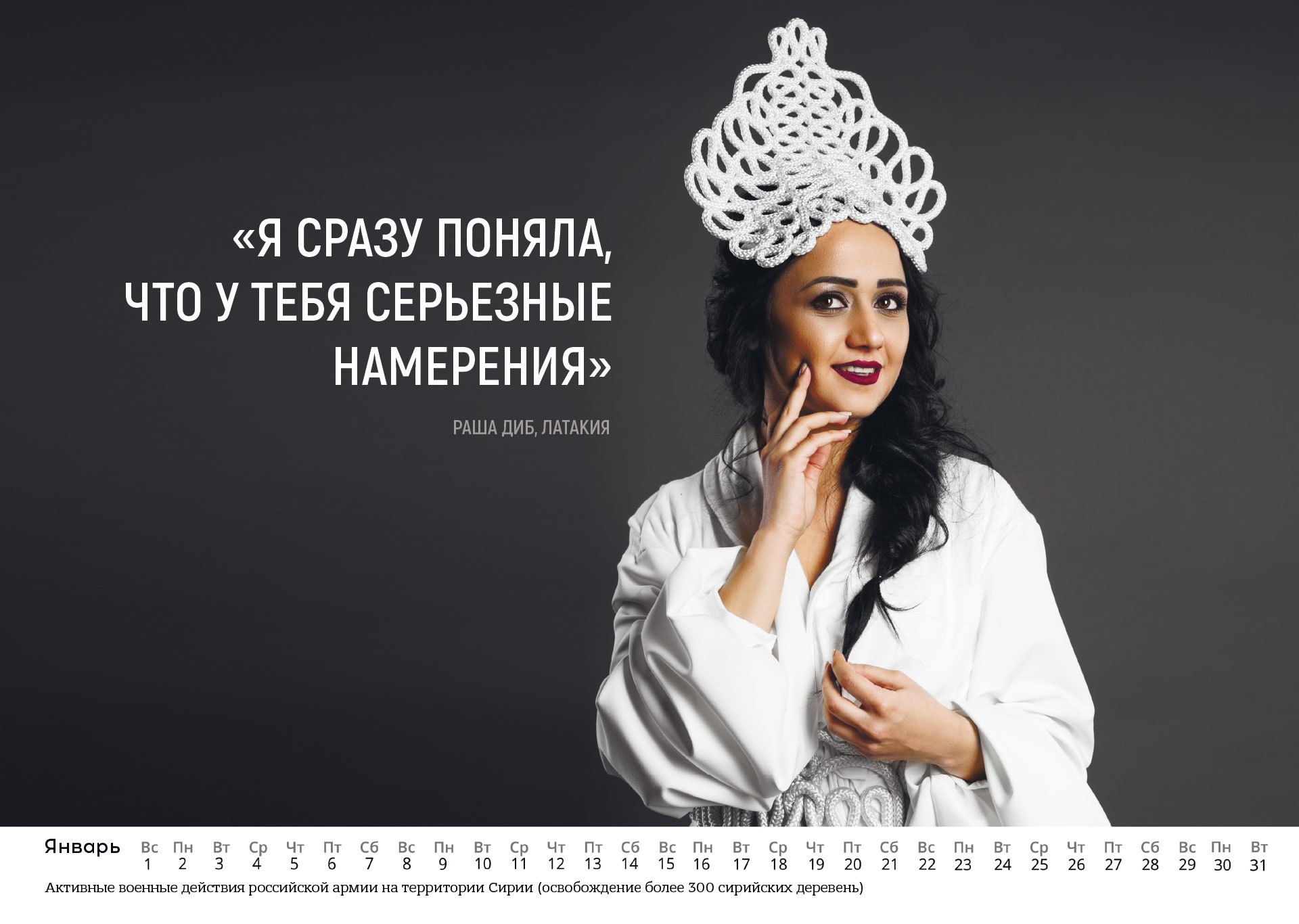 «В каждом месяце сирийская девушка говорит от первого лица российскому солдату о том, что у неё на сердце. Вместо традиционных и привычных нам праздничных дней в календаре отмечены события, связанные с важнейшими позитивными изменениями последних месяцев на сирийской территории», — говорится в пресс-релизе организаторов проекта, находящемся в распоряжении RT.