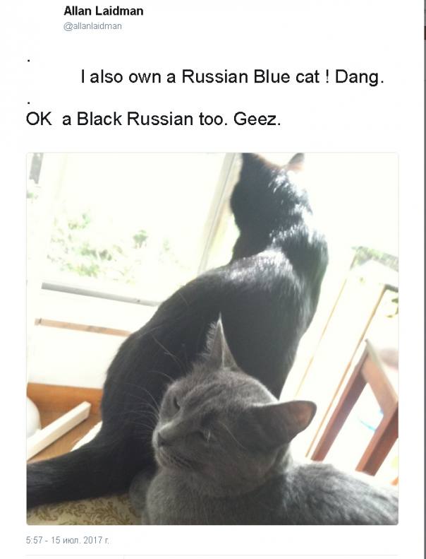 "У меня также есть русский голубой кот! Данга. ОК, черный русский тоже. Блин!!!" - сокрушается другой громадянин США.