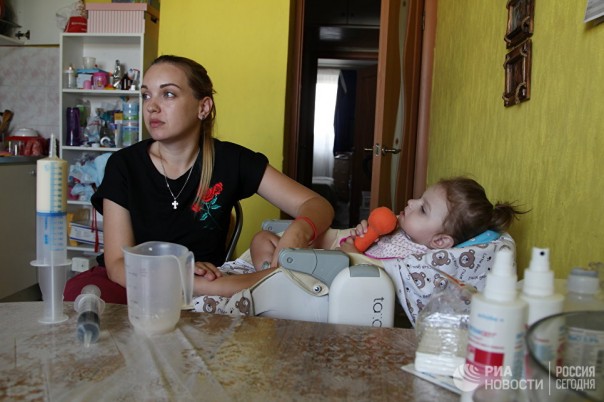 Катя берет большой шприц и наполняет его специальной смесью. В день Ксюша получает литр такой "еды". На животе девочки установлена гастростома, как говорит мама, "кнопочка". Через нее Катя кормит дочь. Ксюшин диагноз занимает в карточке несколько строк, основное заболевание — поражение центральной нервной системы.