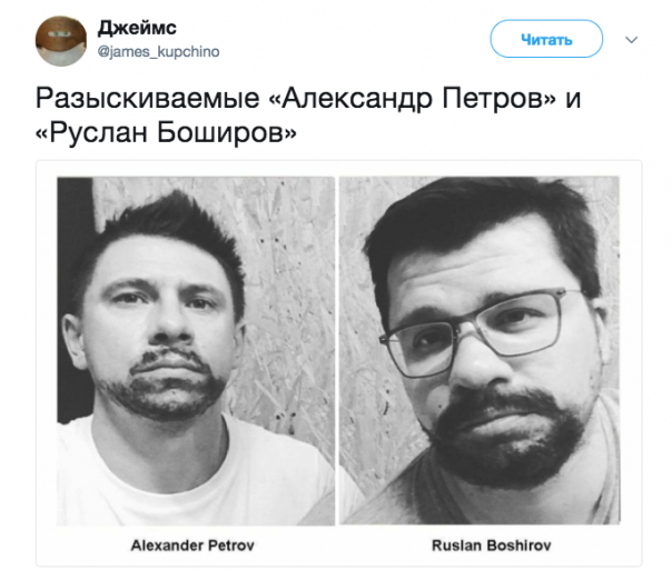 Лондон назвал имена и опубликовал фотографии двух россиян, которых подозревают в покушении на Скрипалей. "Отравителями" оказались некий Александр Петров и Руслан Боширов. А боевое отравляющее вещество преступники якобы хранили во флаконе из-под духов Nina Ricci. Пользователи соцсетей бурно отреагировали на эти новости и решили помочь британцам в их расследовании.