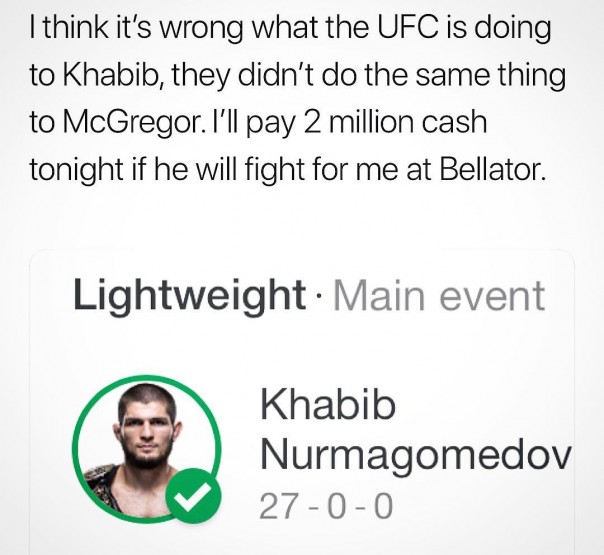 Он выразил мнение, что «UFC ведут себя неправильно по отношению к Нурмагомедову, к Макгрегору они относятся иначе», и заявил о готовности выплатить 2 млн долларов наличными «сегодня же», если россиянин согласиться уйти в Bellator.