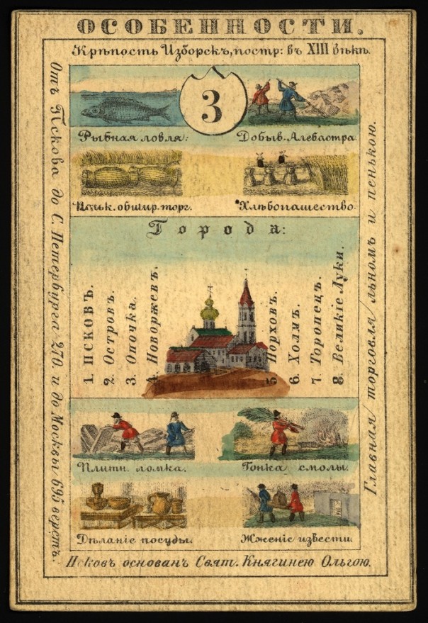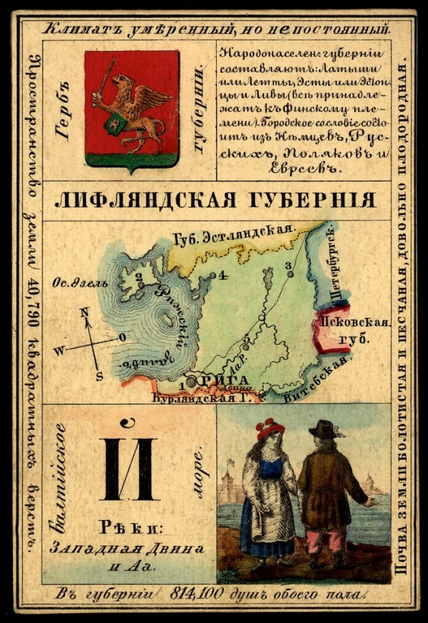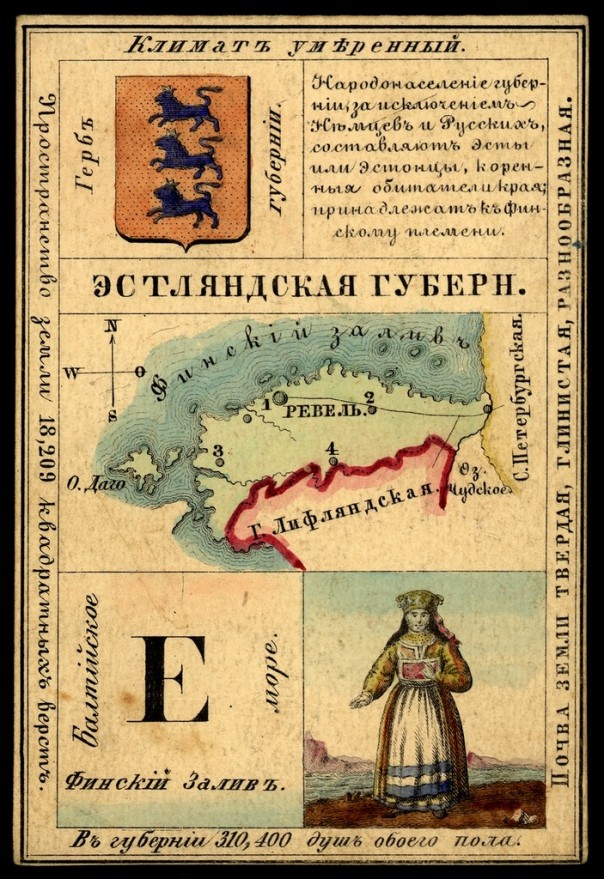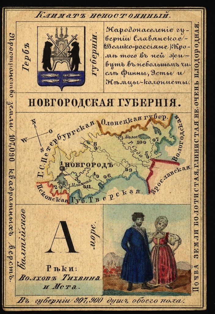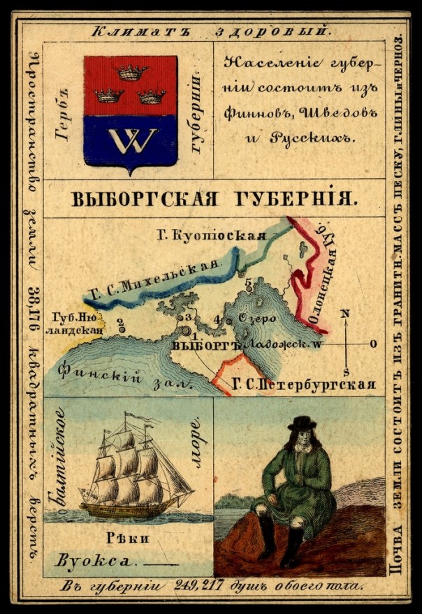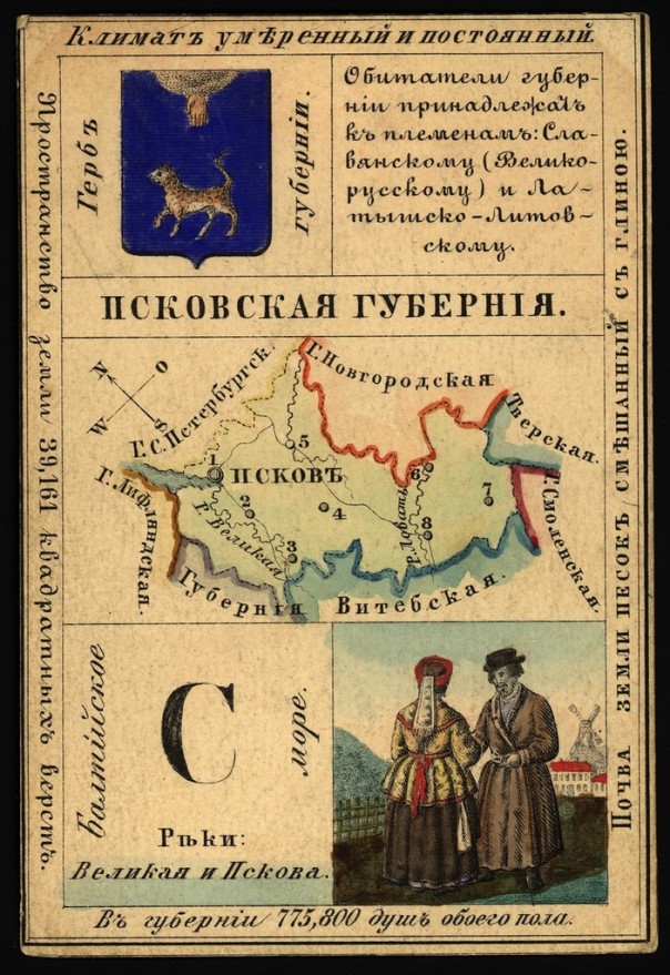 Открытки из сувенирного набора (состоящего из 80 двухсторонних иллюстрированных открыток), по одной на каждую провинцию Российской Империи в том виде, как она существовала в 1856 году. На каждой открытке представлен обзор культуры, истории, экономики и географии провинции. На лицевой стороне открытки описаны главные отличительные особенности провинции: реки, горы, крупные города и ключевые отрасли промышленности. На оборотной стороне каждой открытки изображены карта и печать провинции, приводится информация о населении, а также изображена традиционная одежда местных жителей.