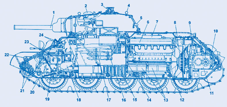 1 – пушка Л-11; 2 – люк для вентиляции, 3 – смотровой прибор кругового обзора; 4 – рым; 5 – заглушка отверстия для стрельбы из револьвера; 6 – двигатель; 7 – воздухоочиститель; 8 – главный фрикцион; 9 -стартер; 10 – бортовой фрикцион; 11 – коробка передач; 12 – подмоторная рама; 13 – аккумуляторы; 14 – моторная перегородка; 15 – вертикальные кассеты со снарядами; 16 – сиденье командира; 17 – укладка снарядов на правой стенке боевого отделения; 18 – сиденье механика-водителя; 19 - рычаги управления; 20 – педаль главного фрикциона; 21 – баллоны со сжатым воздухом; 22 – буксирная серьга: 23 – радиостанция; 24 – зеркальные приборы наблюдения механика-водителя.