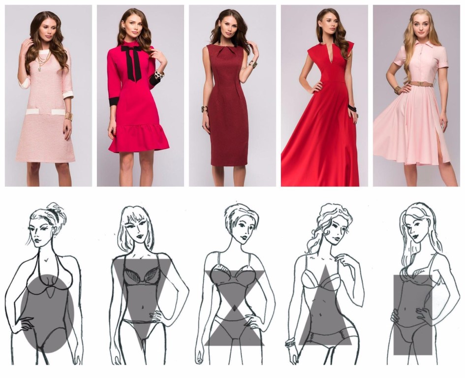 • Обладательницы фигуры, которая напоминает песочные часы могут позволить себе облегающие платья, отлично подойдут трапециевидные платья, юбки, не стоит прятать такую фигуру в мешковидные платья.