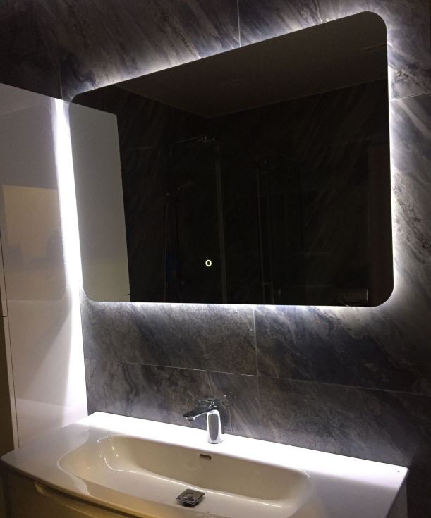 В некоторых случаях к зеркалам применяется подсветка, которая имеет свою температуру света, мощность. Подобное решение лучшим образом подходит для нанесения макияжа, когда под идеально поставленным светом хорошо видно текстуру кожи и что с ней необходимо делать. Здесь могут быть разные типы выключателей вплоть до встроенных в полотно. Вне зависимости от системы, она всегда обладает влагозащитой.