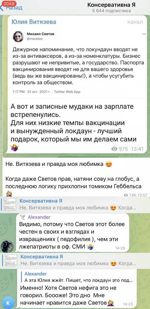 Антиваксеры из числа «радикальных консерваторов», ярые борцуны с извращенцами и самые активные поборники традиционных семейных ценностей уже даже Светова готовы рукопожать. И его педофилия в их борьбе с вакцинацией им уже не кажется таким уж страшным грехом.