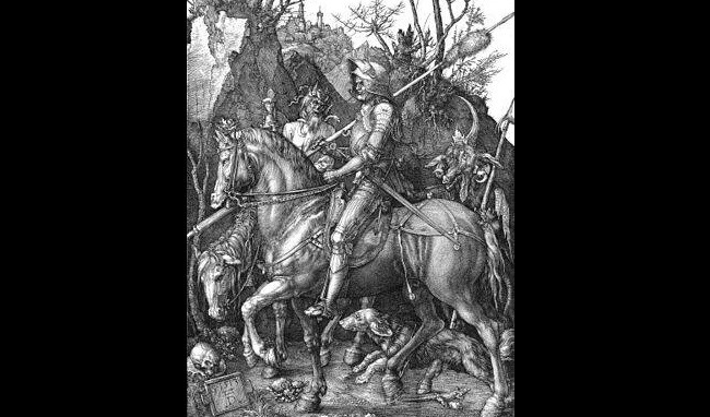 А вот знаменитая гравюра А. Дюрера «Рыцарь, смерть и дьявол», 1513 г.: