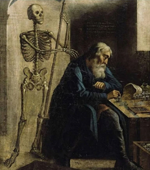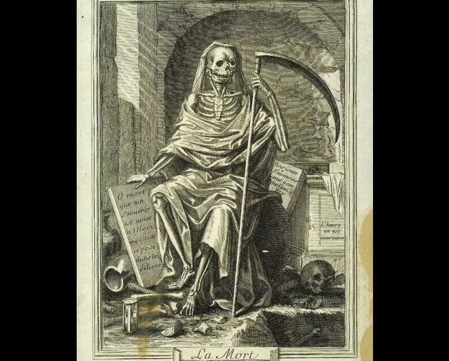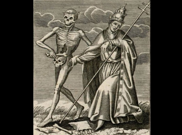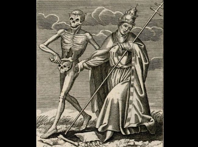 Представленная ниже гравюра иллюстрирует тезис о неизбежности и неотвратимости смерти, которая не делает различий между королями, церковными иерархами и нищими: