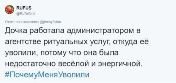 Популярный американский телеведущий Джимми Фэллон в своем твиттере регулярно организует различные опросы с обменом историями из жизни от подписчиков. Вот один из таких опросов с предложением поделиться забавными и необычными историями на работе, которые привели к увольнению.