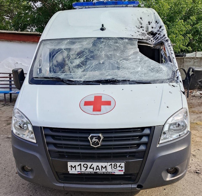 5 июля в Каховке во время рабочего вызова к больному карета скорой помощи была поражена оператором БПЛА с правого берега Днепра. По фотографии видно, что оператор дрона целился именно в водителя скорой помощи, несмотря на красный крест на капоте реанимобиля.