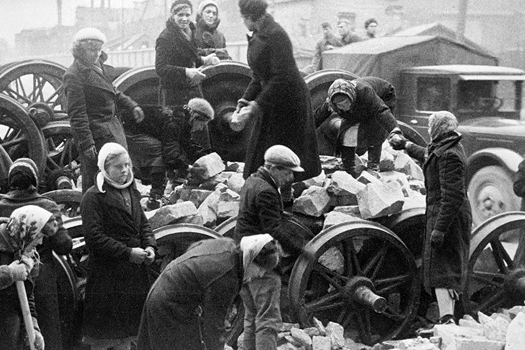 Жители города на разборе завалов после бомбежки у Кировского завода