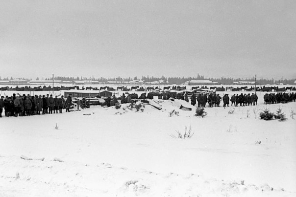 Делегация из числа партизан и крестьян из деревень Партизанского края доставляет жителям блокадного Ленинграда обозы с хлебом