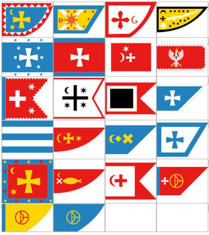 Как видим, здесь только три флага с желтым полем, пять -- с синим и девять -- с красным. Причем, есть и зеркальные отражения рисунка флагов, что указывает на военное практическое применение флага. Поэтому приплетать к истории украинского флага еще и второразрядные флажки казачьих сотен это следствие невежества хуторян со степенями.