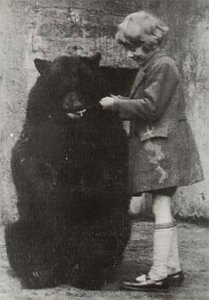 В 1919 году её забрали в Лондонский зоопарк, где пятью годами позже ее увидел сын Алана Милна – Кристофер Робин. Четырёхлетний мальчик подружился с ней и часто навещал. На фото: Виннипег в зоопарке в 1924 году.