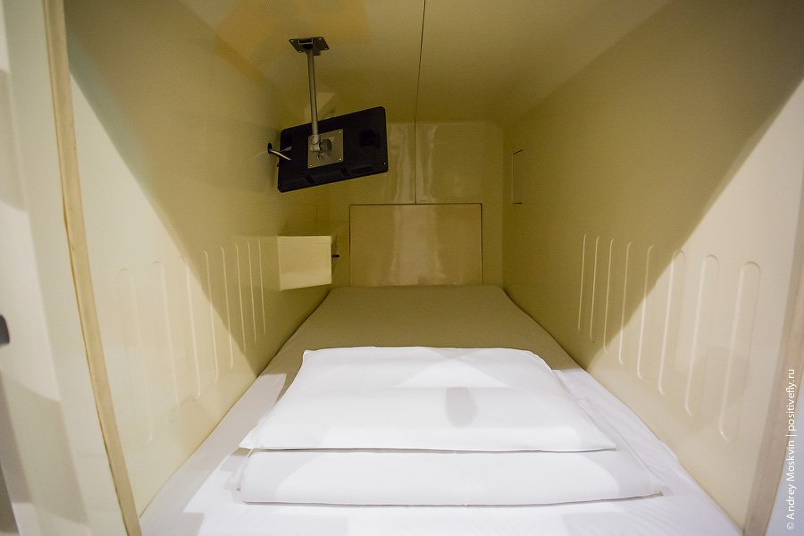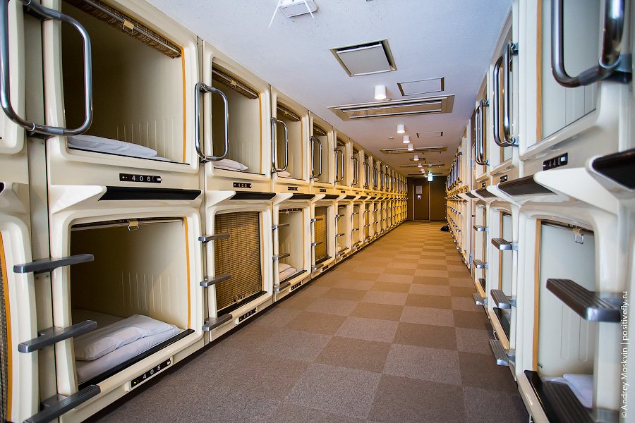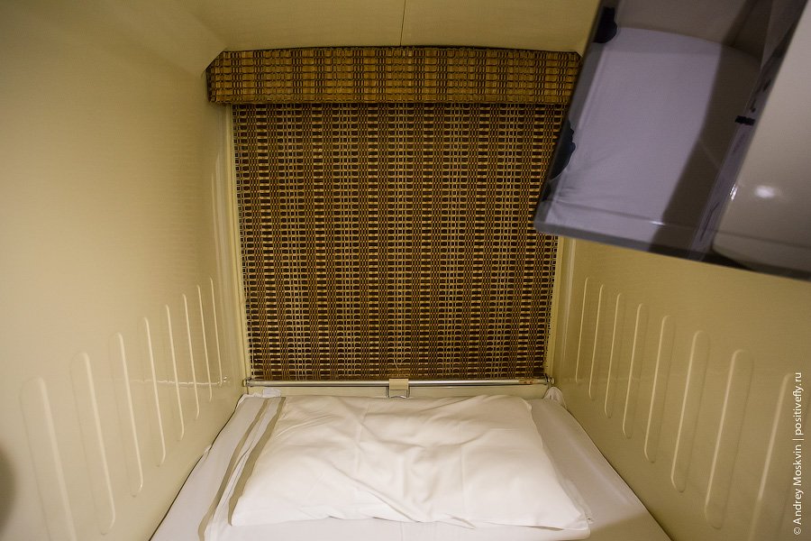 11. В сторону гламур. Так выглядят жилые помещения. Череда уходящих за горизонт капсул. Слева горит свет — там кто-то обустраивается, в закрытых ячейках спят. Сразу напомнило авиаперевозку для животных.