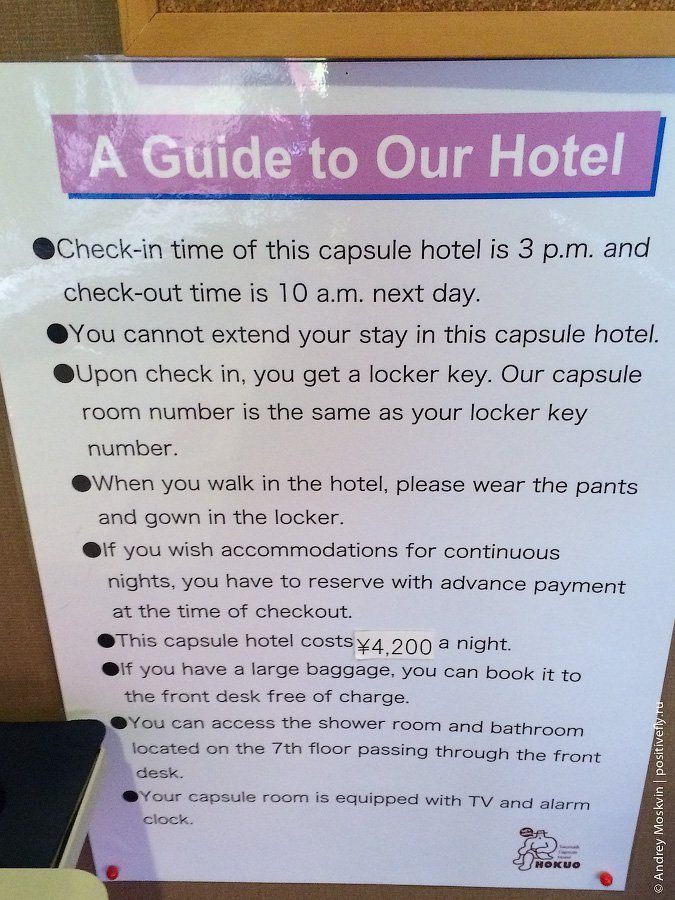 7. Мне выдали ключ от номера (как я думал), и я поехал на лифте без обуви на 4 этаж. Ключ от номера оказался ключом от микроскопического шкафчика в раздевалке. В шкафчике лежало полотенце и халат. Мой рюкзак с фотоаппаратом и ноутбуком туда не влез — пришлось брать в «номер».