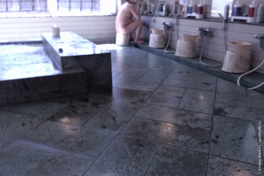 20. Ладно, поспать не удалось, пойду помоюсь. И тут очередной сюрприз. Именно так, как на фото показано, и происходит процесс омовения. Заходишь в душевую. Душей в обычном понимании нету, японцы сидят по кругу на табуретках и моют себя из тазиков. Ну что делать? И я сел. А мысли сами стали развивать историю той попы, которая сидела на этой табуретке до меня.