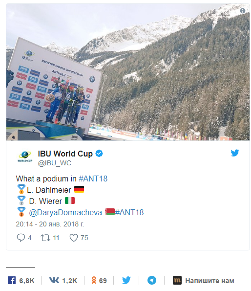 После этого Домрачева замедлилась и позволила Вирер прийти к финишу второй. Первое место заняла немка Лаура Дальмайер. Вот как это выглядело: