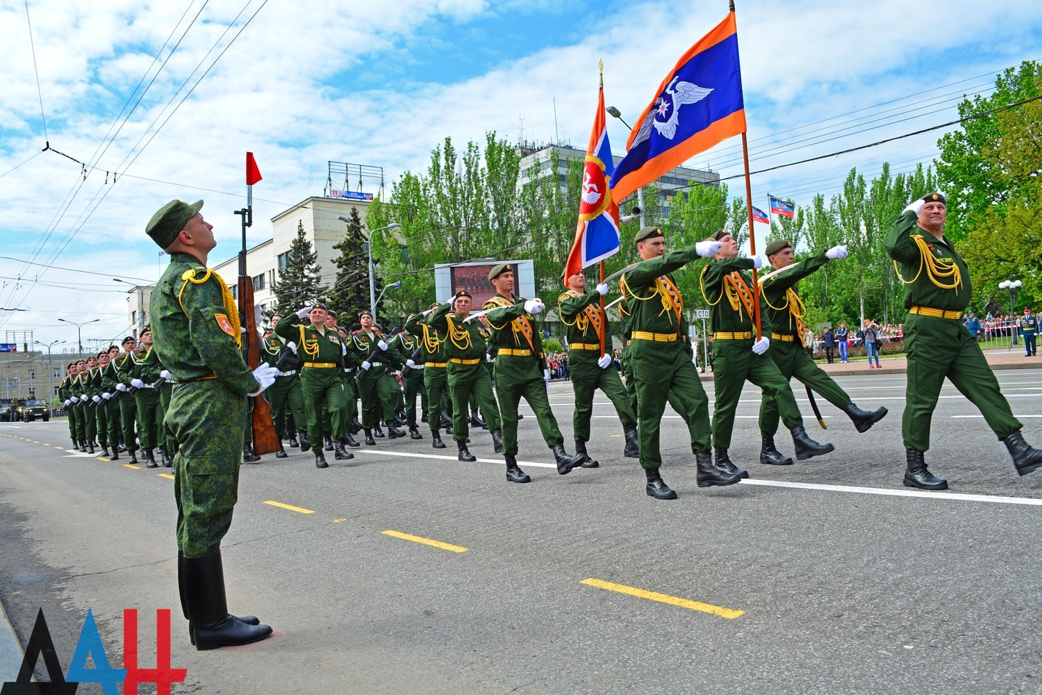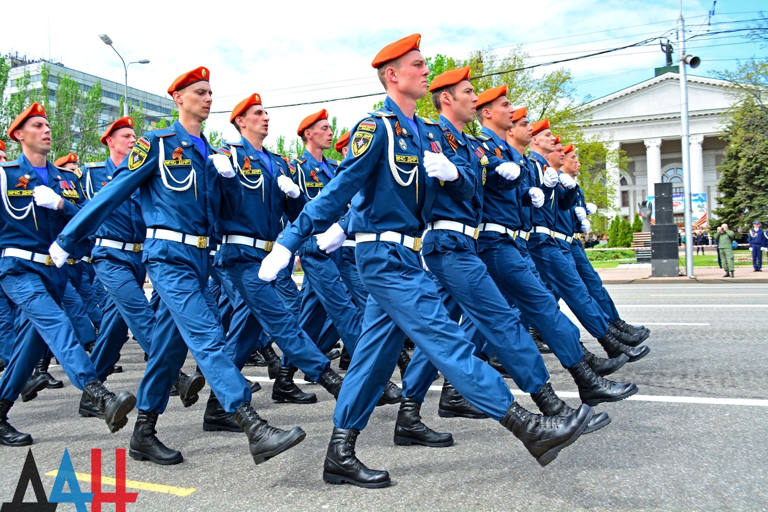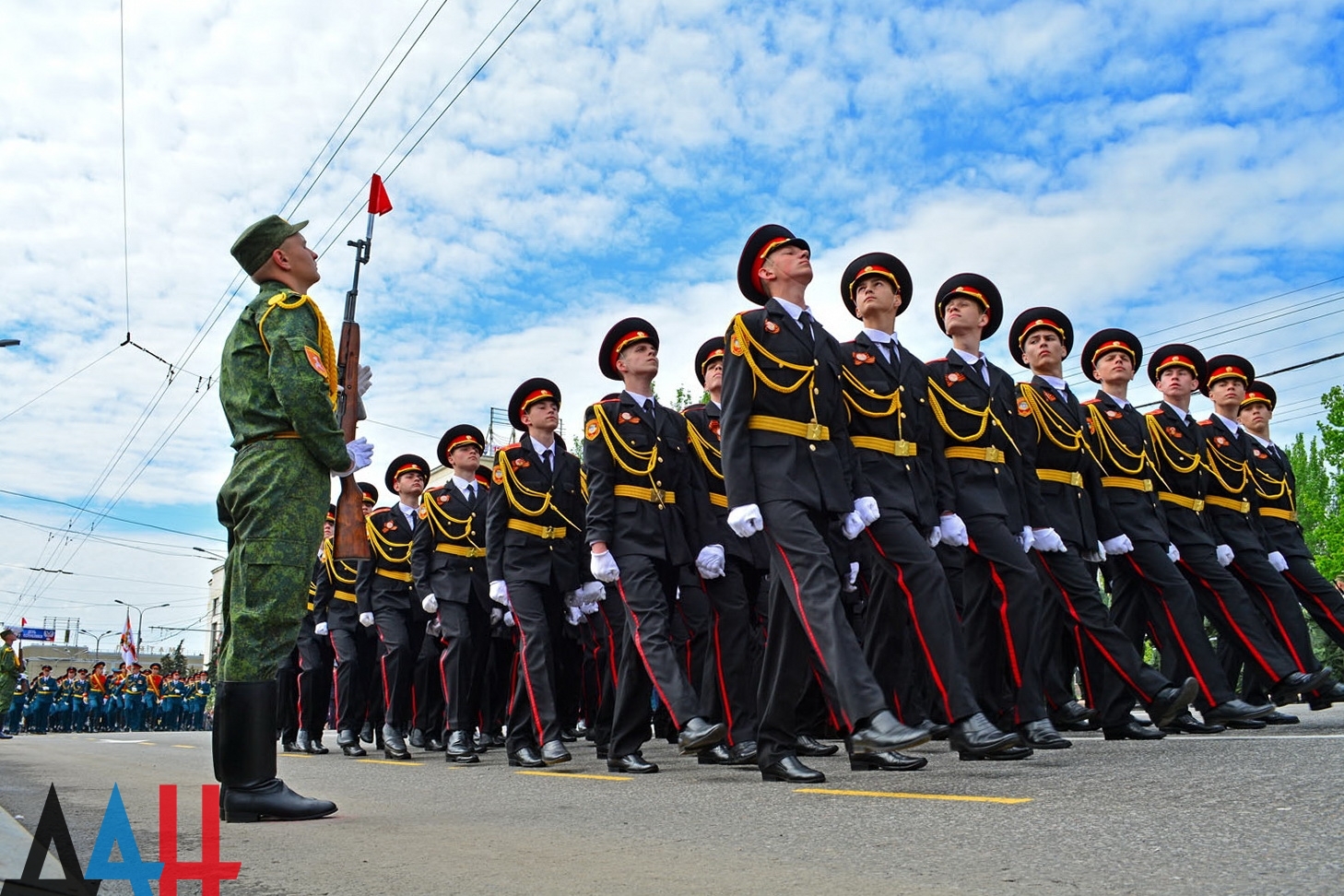 Военный парад в честь 71-й годовщины Победы в Великой Отечественной войне прошел сегодня в Донецке. Торжественным маршем по центральной улице столицы прошли военнослужащие, сотрудники МЧС и МВД, курсанты военных училищ.