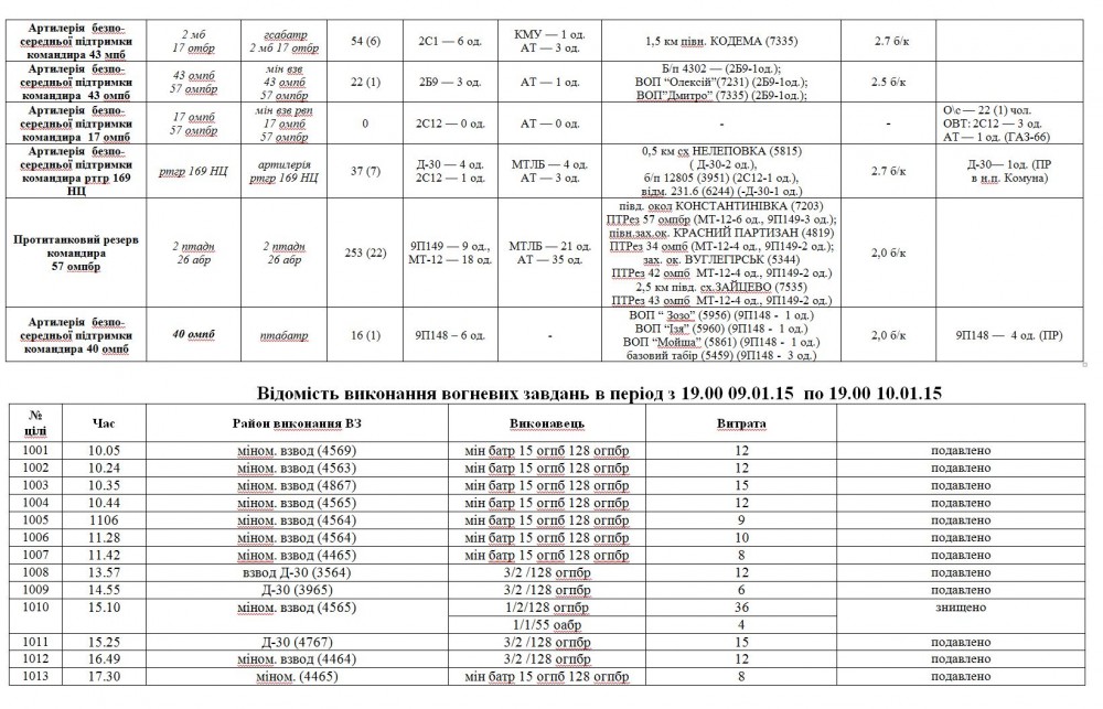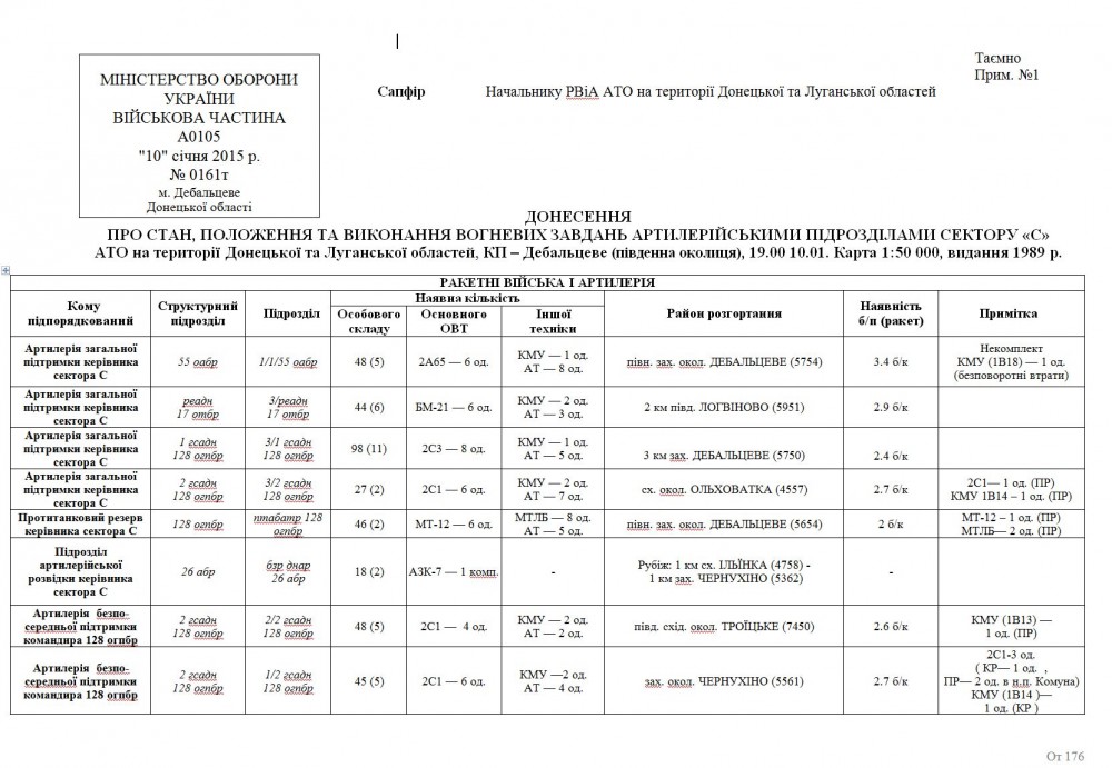 Еще один эксклюзив из Дебальцевского котла. Полный расклад по всей ствольной и реактивной артиллерии сектора С на начало зимней кампании 2015 года. Номера частей, личный состав, материальная часть, дислокация, боекомплект, потери. Документ должен был оставаться засекреченным до 2020 год