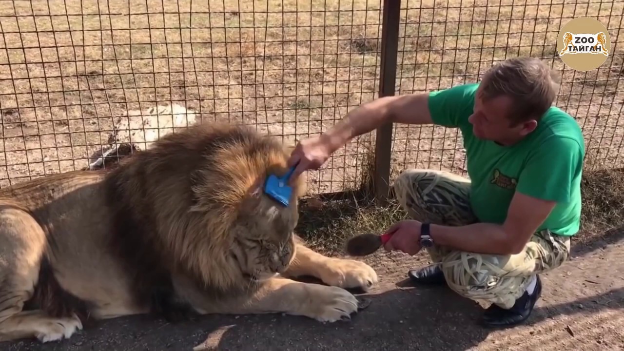 Как Олег Зубков из парка львов Тайган Республика Крым льву Малышу прическу делал, все львы в прайде считают его вожаком.