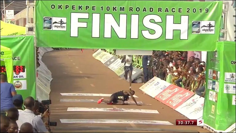 На 10-километровом забеге кенийский спортсмен помог закончить гонку сопернику, которого покинули силы всего в нескольких метрах от финиша.