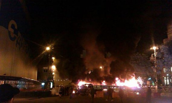 На Крещатике, возле ЦУМа, загорелась баррикада Майдана.