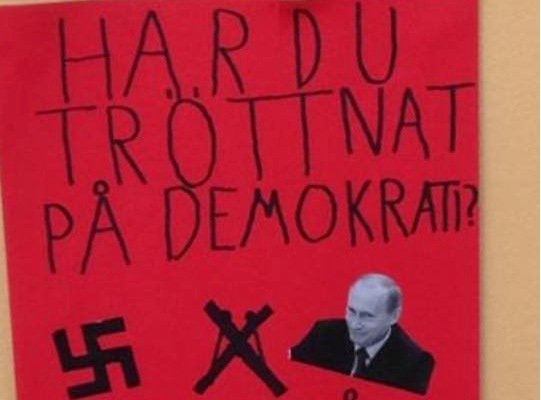 Плакат со свастикой и Путиным вполне уместен на стене в шведской школе? "Вы устали от демократии? Голосуйте за партию Диктаторских демократов!" Этот милый плакатик - ничто иное как проект по рисованию, выполненный учениками седьмого класса в одной из школ Швеции два месяца назад. Задание придумать шуточную рекламу выдуманной политической партии было приурочено к состоявшимся 14 сентября выборам.