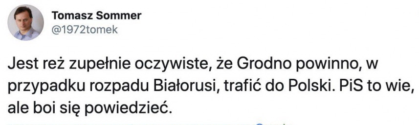 «Совершенно очевидно, что в случае распада Белоруссии Гродно должно отойти к Польше. ПиС [польская правящая партия] это знает, но боится заявить», – написал главный редактор журнала «Najwyzszy Czas!» Томаш Соммер. Источник