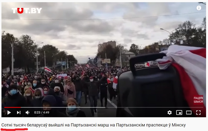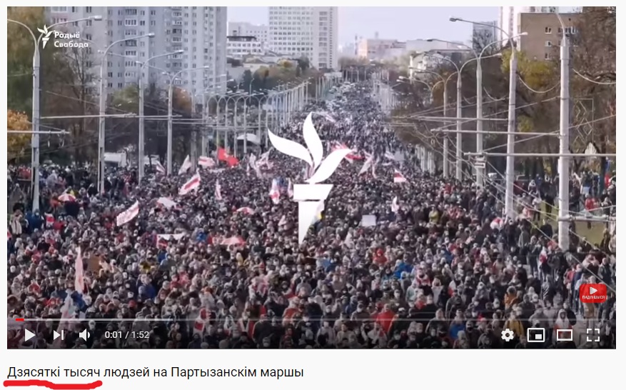 Ну а если кому интересна реальная численность сегодняшнего шествия в 2-миллионном Минске, то я нашёл одно крайне непрофессиональное видео у того же Тут.бая сегодня. Они во время съёмки нарушили главное железное правило любых операторов оппозиционных каналов (без иронии говорю). Дело в том, что при съёмке оппозиционных шествий оператор должен начать съёмку от самого начала (или самого конца)колонны, затем провести вдоль неё, но обязательно за мгновение (не раньше и не позже!) до того как камера дойдёт до конца колонны, остановить камеру и или закончить съёмку, или повести камеру в обратном направлении. Таким образом, зритель сам, ошеломлённый массовостью, ДОРИСУЕТ в своём воображении эту колонну, подсознательно продлив её дальше. Он ни в коем случае не должен осознать, что уже увидел её всю (за вычетом последнего 1% колонны). Так вот, сегодня в одной из видюшек Тут.бай облажался и захватил оба конца колонны. Там не то что сотнями тысяч, там и десятками тысяч не пахнет. Посмотрите внимательно видюшку- захвачены оба конца: