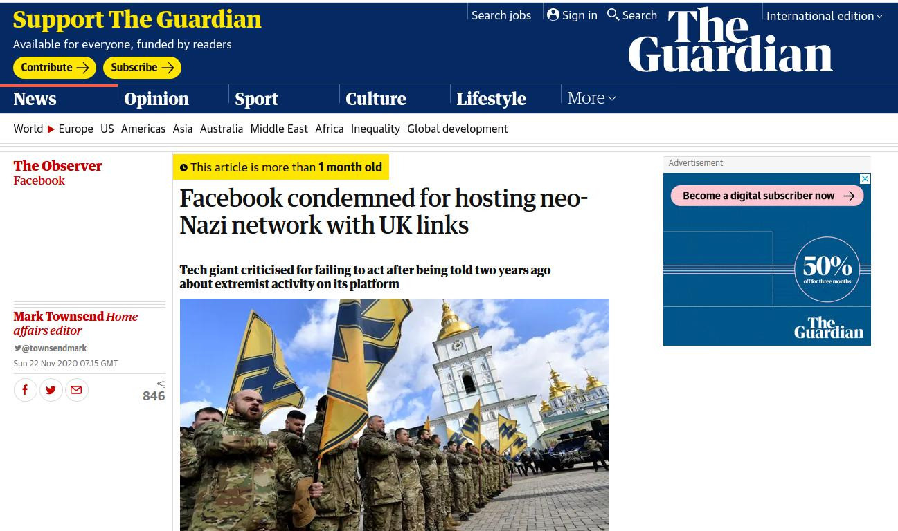 В октябре этого года британская "Гардиан" сообщила, что в настоящий момент в соцсети зарегистрировано более 40 пабликов подобной направленности, которые открыто торгуют фашистской атрибутикой и восхваляют последователей Адольфа Гитлера. При этом Лондонский Центр противодействия цифровой ненависти утверждает, что продажу символики в Фейсбуке организуют не кто иные, как "Мизантропик дивижн" и "Азов", а вырученные средства идут на дальнейшее финансирование группировок.