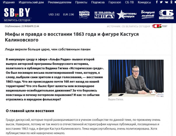 2022 год, объявленный в Белоруссии годом исторической памяти, начался с атаки на культ Кастуся Калиновского. Газета «СБ-Беларусь сегодня», главный печатный орган администрации президента, опубликовала материал Вадима Гигина «Мифы и правда о восстании 1863 года и фигуре Кастуся Калиновского».