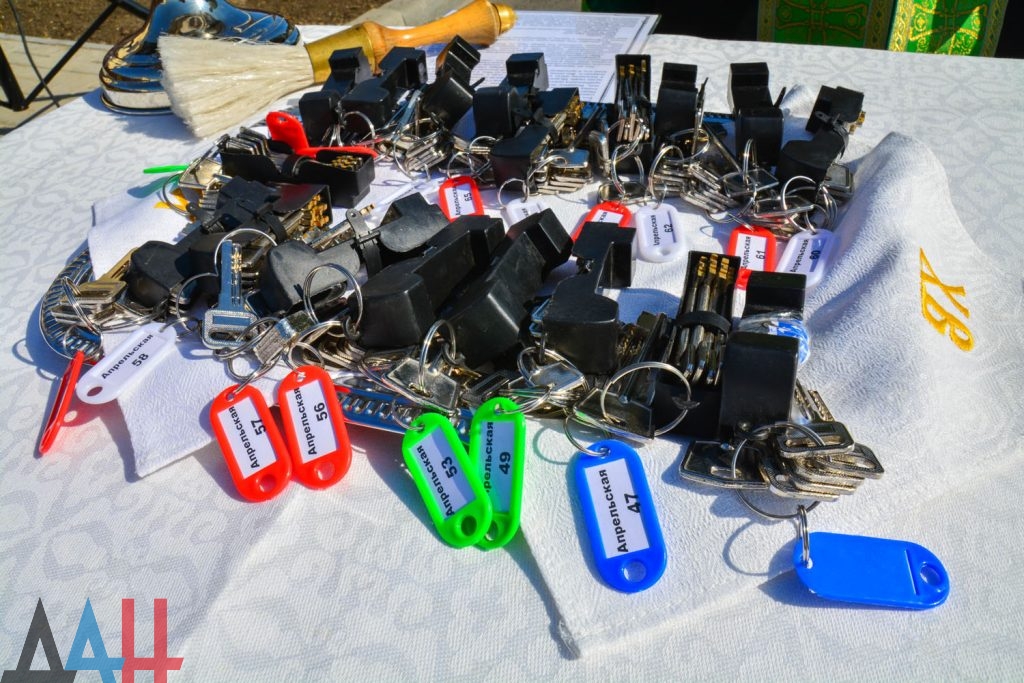 Перед вручением ключей клирик Донецкой епархии отец Сергий провел службу, освятил дома и благословил новых жильцов.