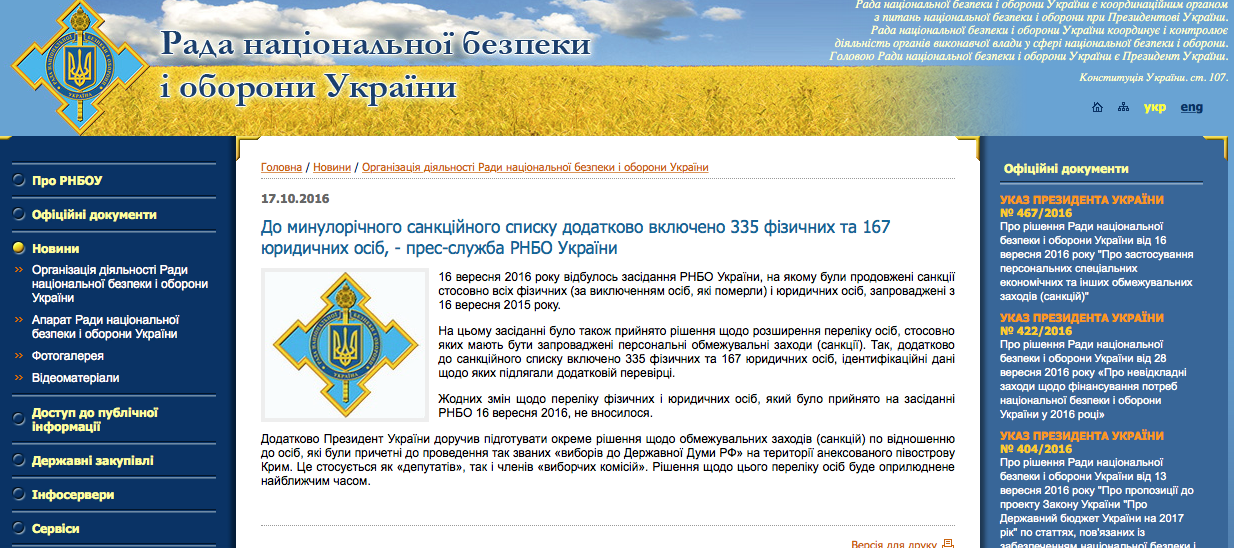 В день появления на свет указа № 467/2016, 17 октября, на официальном сайте СНБО появилось короткое сообщение, в котором говорилось, что никаких изменений в решение от 16 сентября 2016 сентября украинский Совбез не вносил. И – самое главное: СНБО сообщает о том, что 16 сентября 2016 года были продолжены санкции «в отношении всех физических лиц (за исключением тех, которые умерли) и юридических лиц, которые были введены 16 сентября 2015 года».