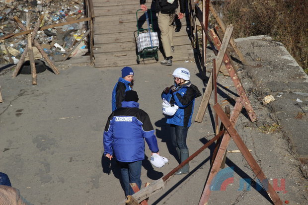 Представители СММ ОБСЕ также сфотографировали места попаданий украинских боеприпасов, после чего в спешном порядке удалились на украинский блокпост.