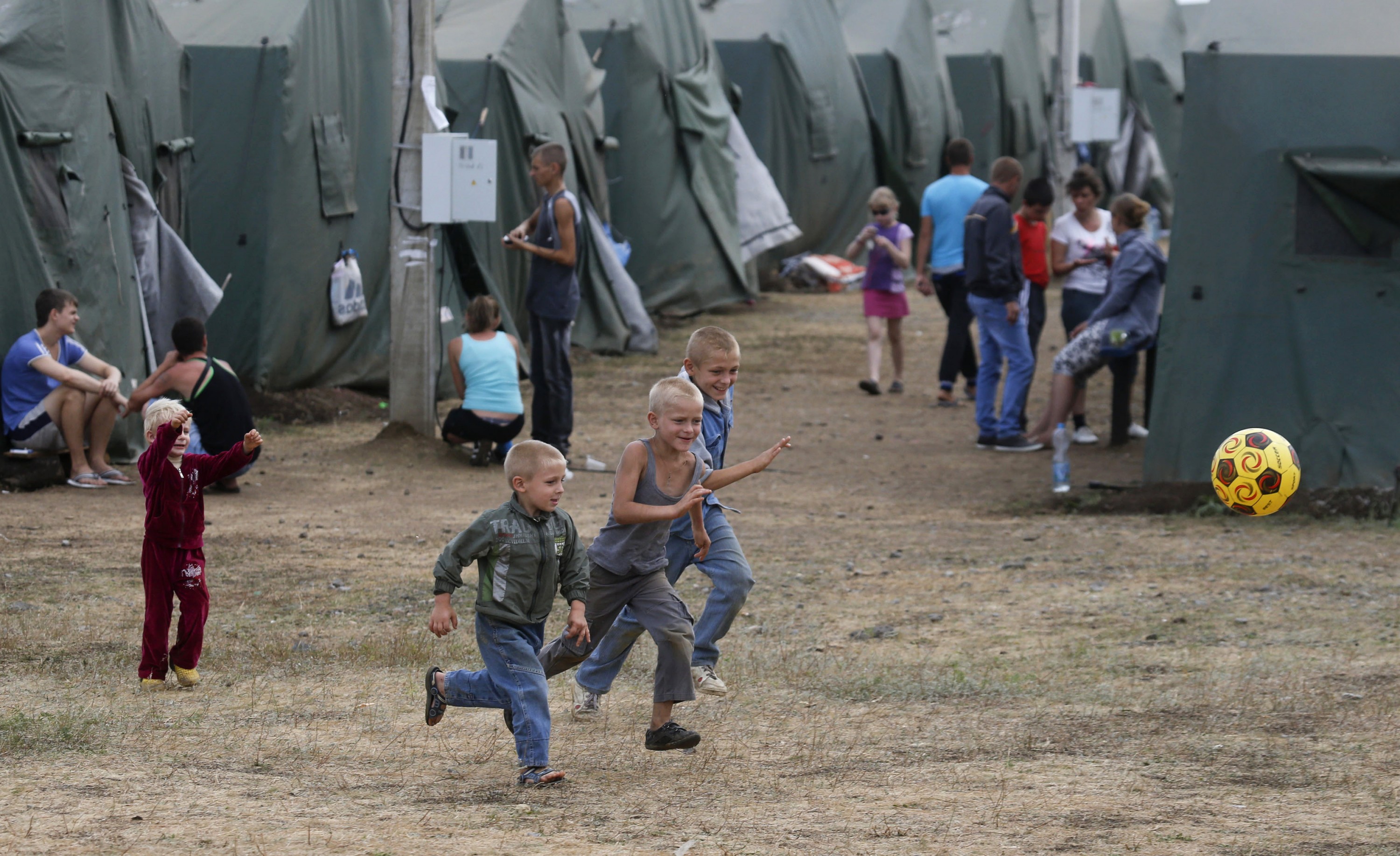 Дети играют с мячом в палаточном лагере для беженцев Донбасса. Ростовская область, 2014г.