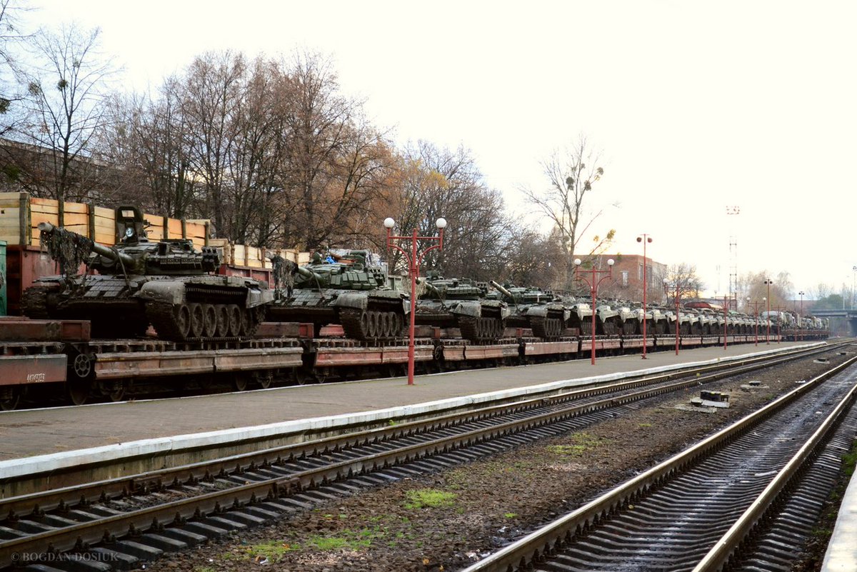 Украинские каратели перед большим зимним наступлением не перестают подтягивать боевые резервы на "восточный фронт". На днях Украина распечатала склады техники в Ивано-Франковске. Нехватка боевых бронеединиц вынудила оккупантов прибегнуть к использованию последних резервов, оставшихся со времен СССР. Теперь эта техника гигантскими составами по железной дороге движется в сторону Донецка, что, собственно, и фиксируют на камеры мобильных телефонов и фотоаапараты жители прифронтовых территорий.