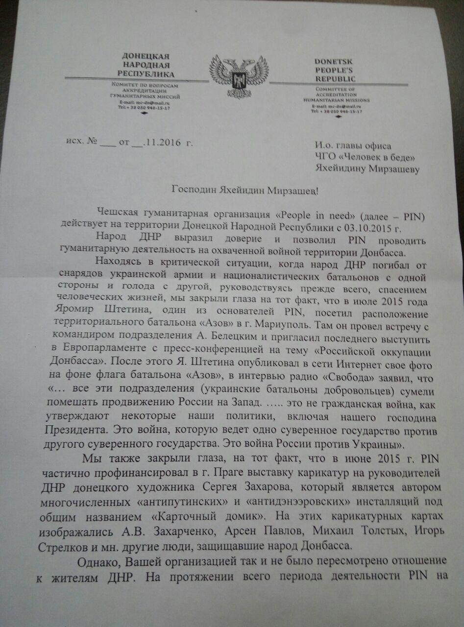 «Двадцать пятого ноября 2016 решением комитета по вопросам аккредитации гуманитарных организаций ДНР прекращена деятельность чешской международной общественной организации «Человек в беде», — отметили в пресс-службе. — Основанием запрета деятельности этой организации и отзывом ранее выданной лицензии послужило систематическое игнорирование требований комитета к реализуемым программам по выдаче гуманитарной помощи жителям ДНР и несоответствии деятельности организации «Человек в беде» ранее заявленным целям».
