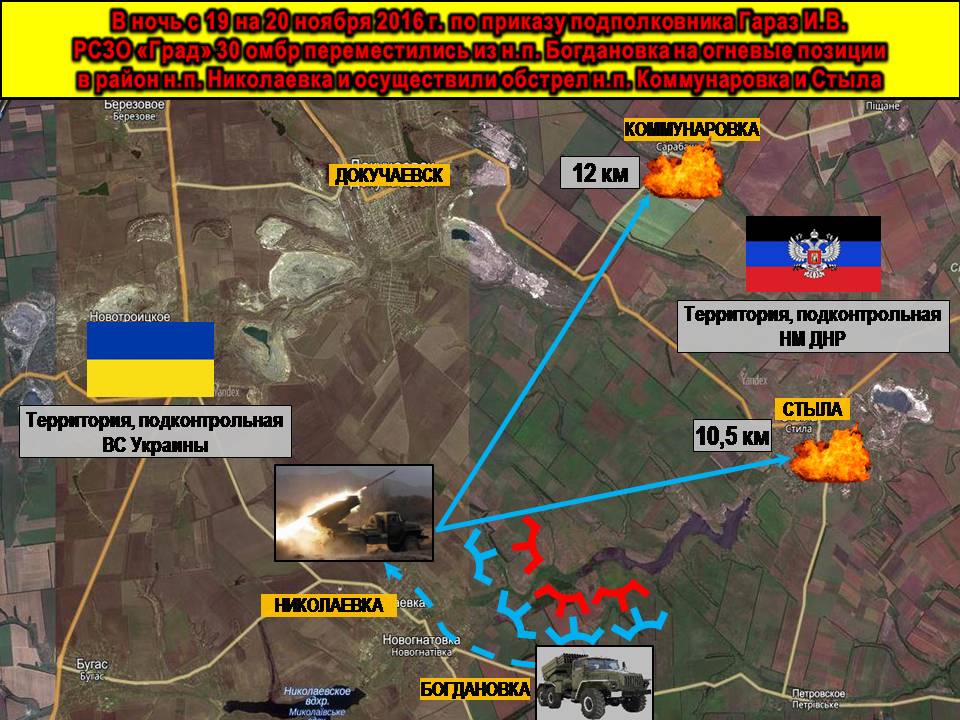 Установлено, что огонь из установок «Град» по селам Коммунаровка и Стыла в ночь на 20 ноября велся из района оккупированной украинскими силовиками Николаевки. Руководил обстрелами командир 30-й бригады ВСУ подполковник Иван Гараз, участвующий в карательной операции против народа Донбасса с весны 2014 года. Его действия предложено квалифицировать, в частности, как акты геноцида и нарушения законов и обычаев войны.