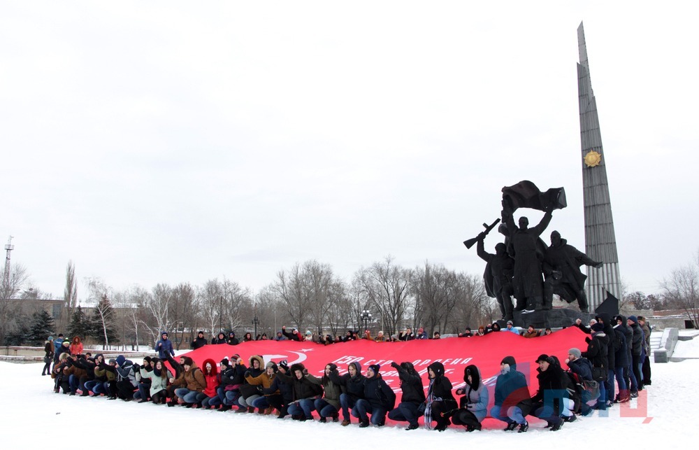 В Луганской народной республике не намерены отступать от позиций неприятия надругательства над памятью предков и своей истинной великой историей, как это ныне практикуется на Украине. Молодые активисты ЛНР вместе с общественными деятелями России развернули у памятника воинам-освободителям в Луганске копию Знамени Победы площадью 200 кв. м. в рамках акции "Марш Победы - Молодая гвардия шагает по миру".