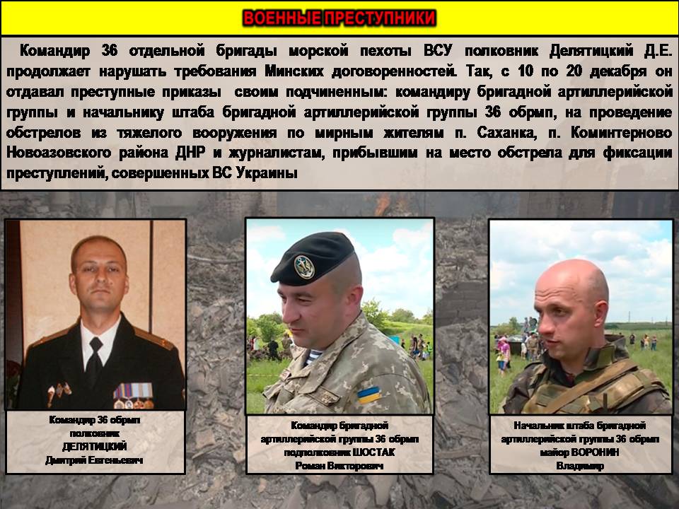 Досье содержит данные о командире 36 отдельной бригады морской пехоты (обрмп) ВСУ, полковнике Дмитрии Делятицком и его подчиненных — командире бригадной артиллерийской группы подполковнике Романе Шостаке и начальнике штаба этой же группы майоре Владимире Воронине.