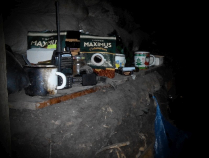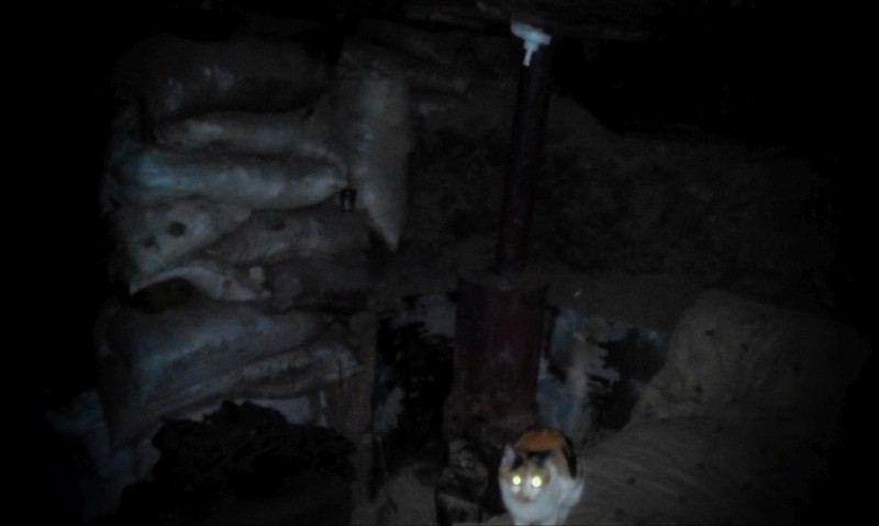 Фотографируя этот «подвальчик», я и не догадывалась, что внутри находится пушистый обитатель. Лишь просмотрев после снимки в ноутбуке, с удивлением обнаружила сверкающие кошачьи глаза. Фронтовой кот ничем не выдал свое присутствие во время нашего пребывания на позиции.