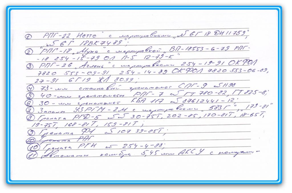 Отмечается, что на месте задержания был обнаружен тайник с противотанковыми гранатами РПГ-22, РПГ–18, РПГ-26, РПГ-7, станковым противотанковым гранатометом СПГ-9, гранатами различных модификаций, пулеметами, автоматами, пистолетами и боеприпасами к ним.