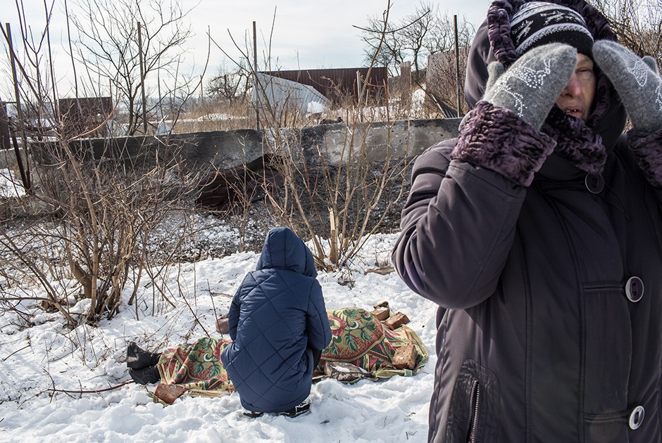24-летняя Надежда Волкова скорбит по погибшей во время обстрела 60-летней матери. Она была убита по пути в магазин утром 1 февраля. Лицом к камере стоит свекровь Надежды Галина Николаевна.