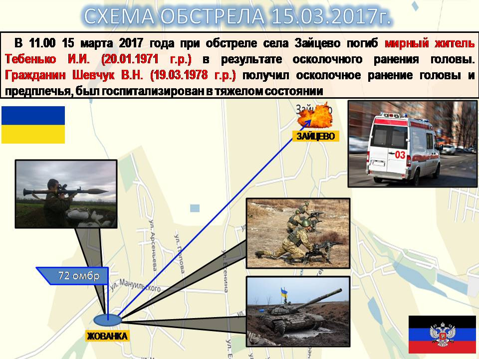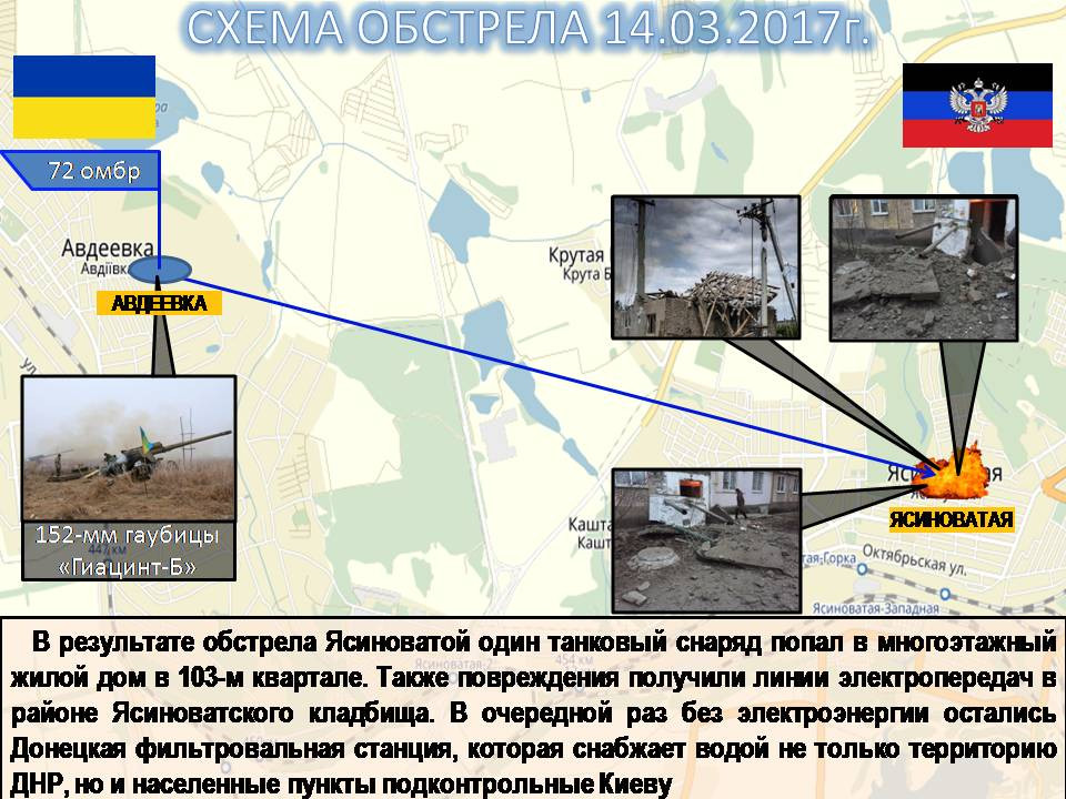 Кроме того, приводится информация о командире 72-й отдельной механизированной бригады полковнике Андрее Соколове, отдававшем с 14 по 15 марта приказы обстреливать мирное население Ясиноватой и поселка Зайцево. В Ясиноватой было отмечено попадание в многоэтажку и повреждения линии электропередачи, питающей Донецкую фильтровальную станцию. В Зайцево под огнем ВСУ погиб мирный житель, еще один получил ранение и был госпитализирован. Огонь велся из районов Авдеевки и поселка Жованка.